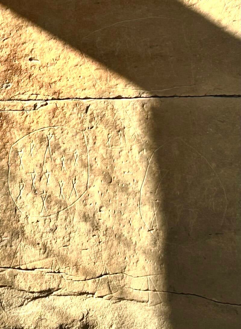 After exploring with the girls on foot, we got out our e-bikes, and after a quick brake pad replacement of my front brake, we headed out to the highest view point to find some ancient writing on stone. The etchings are carved in sandstone on the walls of the great Milk River Valley and are thought to be between 4,500 BP to 3,500 BP. This particular writing depicts a great battle that happened in the area. On our way to the writing, we startled a rabbit and found a deer well camouflaged within the stones.