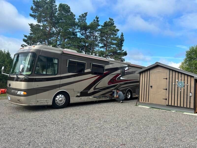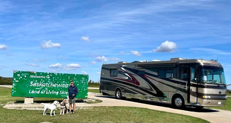 Once back at camp while enjoying a beverage another Monaco came in and Geoff took a walk over and asked the owner (Arnie) if he might know a thing or two about our issues. He wasn't able to help but provided us with his business card and email address and said he would be home tomorrow and if we email him he will provide us with the information of someone who works on his coach. Arnie is from Regina, as is his mechanic.