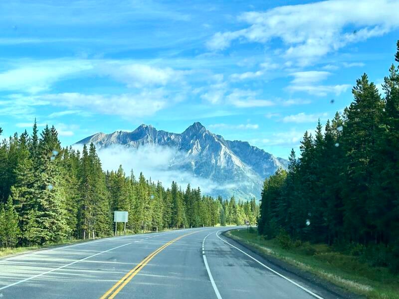 After a relatively good night's sleep, I awoke to Whiskey sleeping on the bed between my legs and have no idea when she jumped up. I can't say that I blame her as it was quite chilly this morning and only Zoey had a nice fluffy blanket to curl up on for the night. The rain had finally cleared and the day was clear and crisp! We made short work of getting ready to leave and were on the road shortly after 9:00 am. After we emptied our tanks, we bid our last farewell to Mount Kidd, which now had a fine dusting of snow on it's peaks, and left the park.